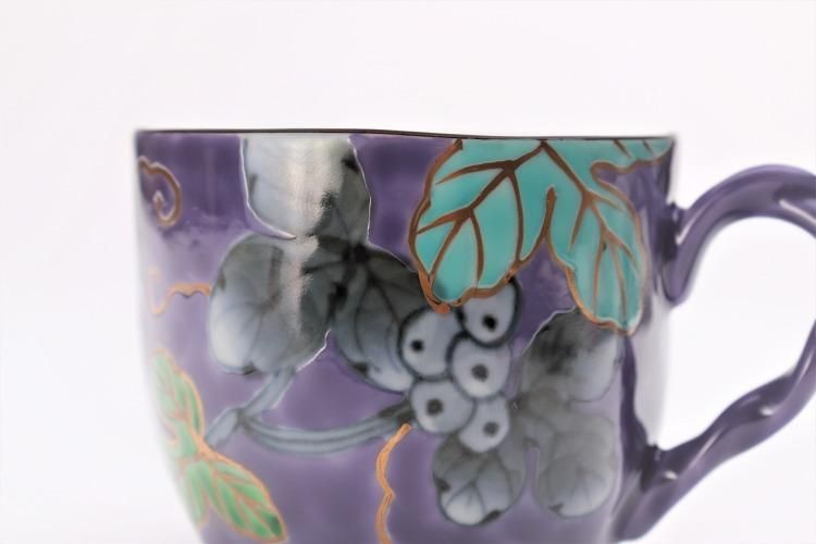 ★福泉窯 染錦ぶどう総柄(紫) 三ツ足コーヒーC/S