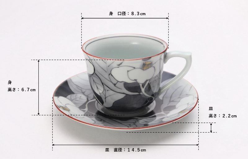 シックな色合いに存在感のある椿が上品なコーヒーカップです。