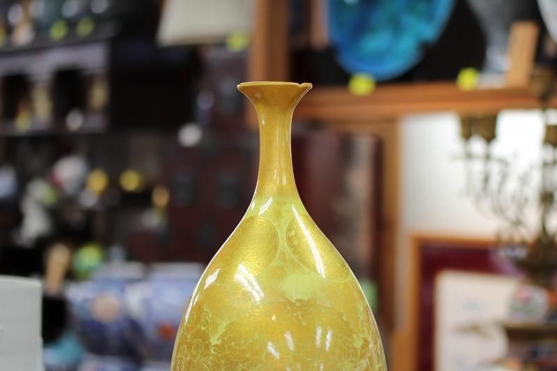 製作技法の中でも難しいもののひとつとされる釉裏金彩(ゆうりきんさい)で仕上げた花瓶です。